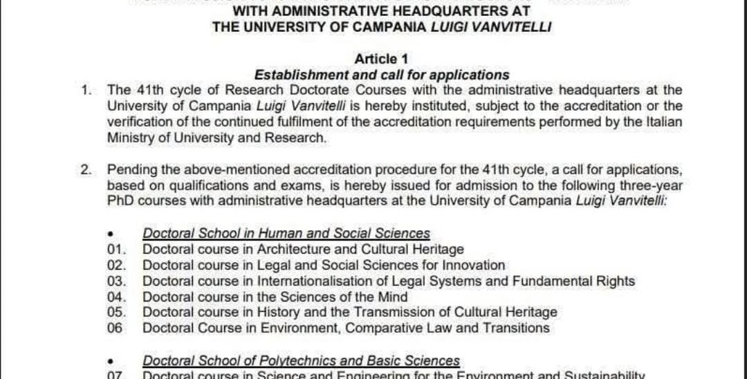 The University of Campania Luigi Vanvitelli has announced its 41st cycle PhD call for applications for admission to 18 PhD programs across Human and Social Sciences, Polytechnics and Basic Sciences, and Life Sciences. Each program spans three years and begins on 1 December 2025.
