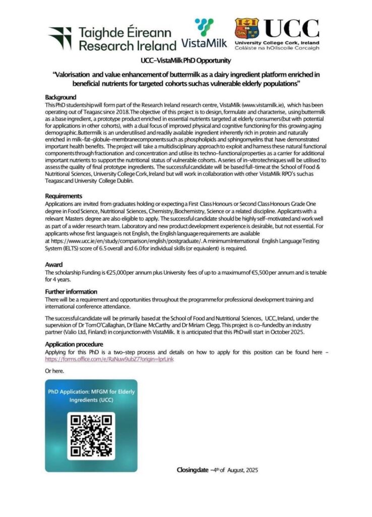 Fully Funded PhD Ireland๐ Calling ambitious researchers in food science, nutrition, and biochemistry! The University College Cork (UCC), in collaboration with VistaMilk Research Centre and Teagasc, is offering a prestigious, fully funded PhD position in Ireland. The research focuses on the valorisation and enhancement of buttermilk as a dairy ingredient enriched in essential nutrientsโespecially for the elderly.