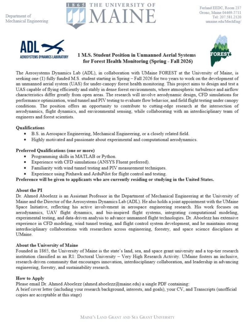 Apply for a Fully Funded MS Position in Unmanned Aerial Systems (UAS) for Forest Health Monitoring at the University of Maine (2026). Work on drone design, CFD, and flight testing with expert supervision.