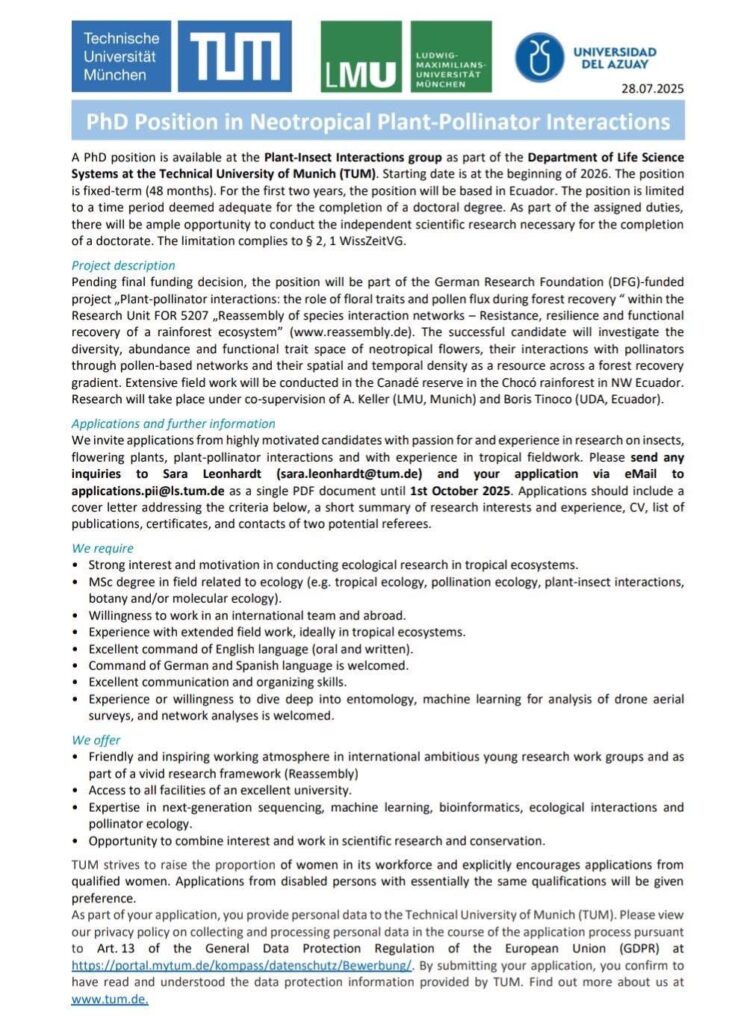 PhD Position in Neotropical Plant-Pollinator Interactions – Are you passionate about tropical ecology, plant-pollinator interactions, and biodiversity conservation? πβ¨ Hereβs your chance to join a fully funded PhD position in Neotropical Plant-Pollinator Interactions offered by the Technical University of Munich (TUM) in collaboration with Ludwig-Maximilians-University Munich (LMU) and the Universidad del Azuay (Ecuador).